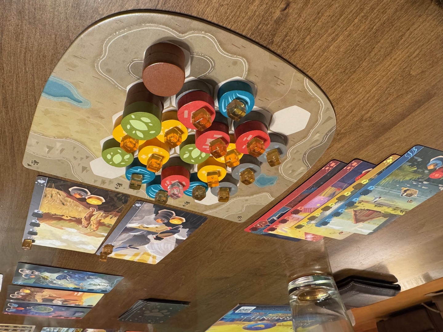 Kevin puts a cube on almost all of his tokens (see photo) and wins easily with 110 points. |